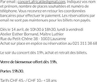Par email : concert.africatile@gmail.com. Indiquez